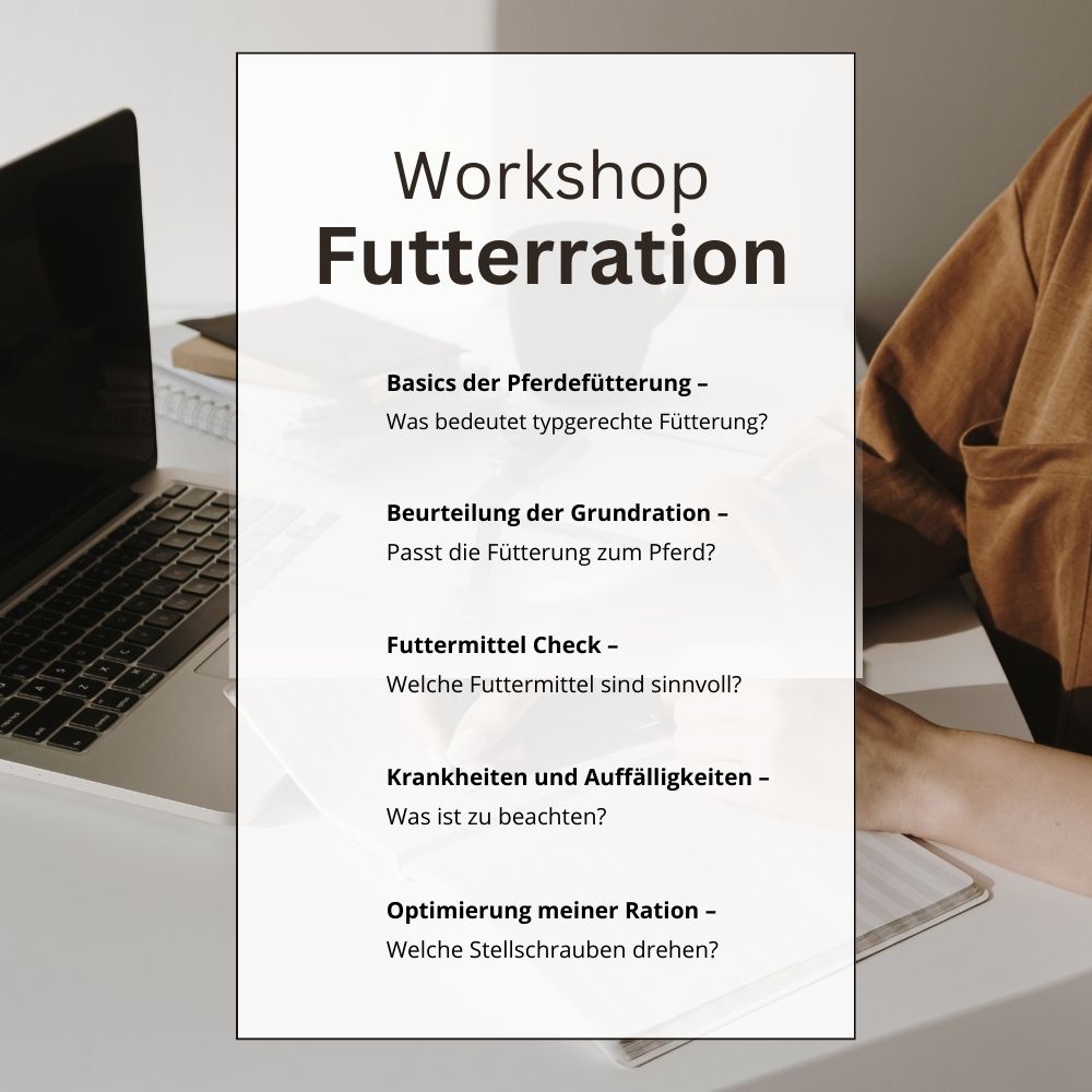 Sie möchten einen Workshop, Lehrgang oder Vortrag für Ihre Stallgemeinschaft oder Verein zum Thema Pferdefütterung und Rationsanpassung organisieren? Ich komme dazu gern zu Ihnen oder kann ein Webinar zu folgenden Kernthemen halten: